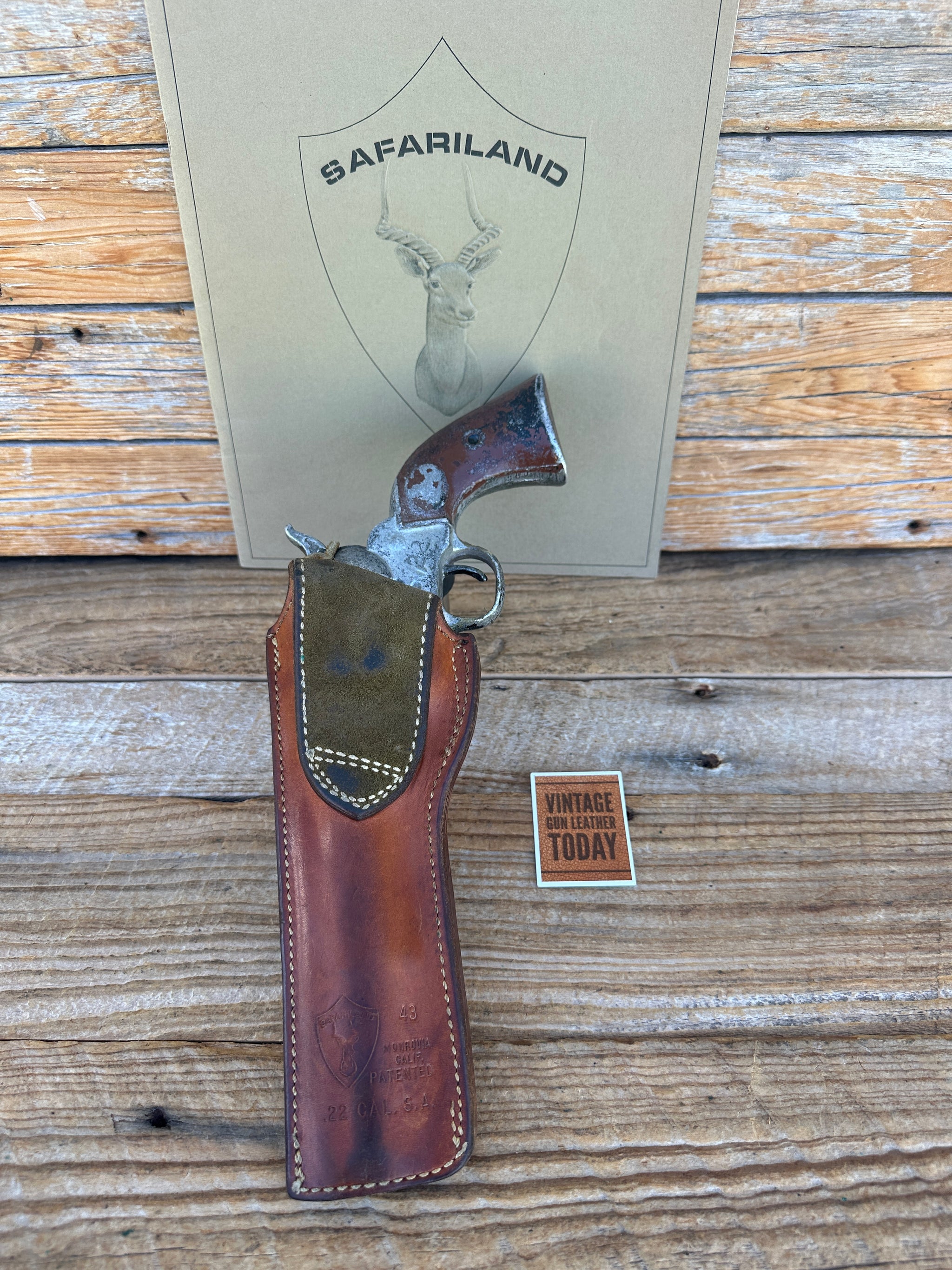 Vintage 1970's Safariland Model 43 Outfitter Holster. This is the early mid 1970's version. Holster has Safariland's Elk Suede lining and sight track. This early version has the rawhide hammer loop which was standard on the Model 42. This rawhide hammer loop was only on this model 43 for a few years. They later replaced it with a retention strap. Leather, stitching and hardware all in very nice condition. This is for a .22 Single Action Revolver up to 6"..