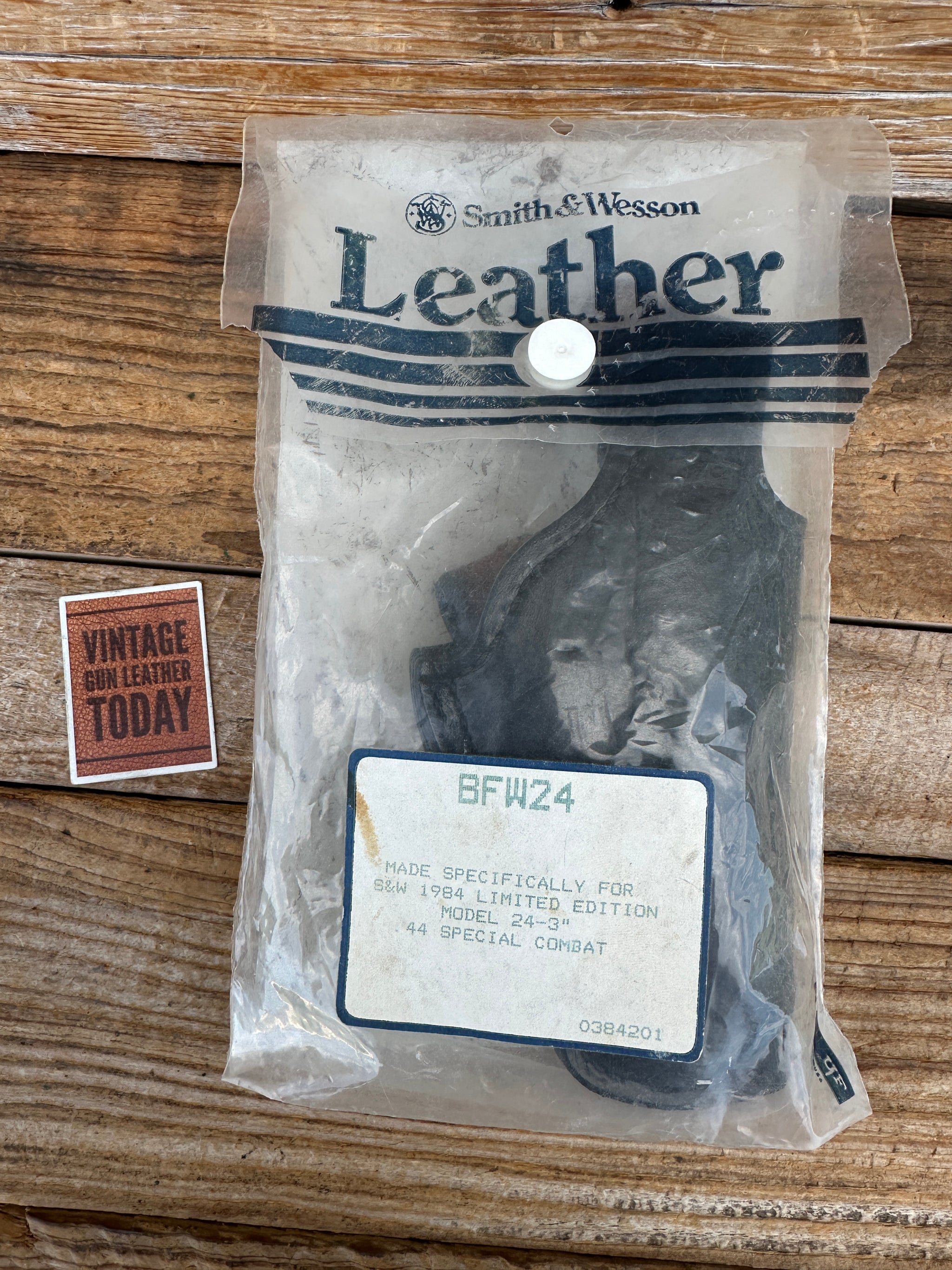Vintage new old stock 1984 Smith & Wesson Limited Addition black leather, suede lined OWB holster. This is for a Smith & Wesson Limited Edition Model 24-3" 44 Special Combat N frame revolver. Rear has loops for a 2 1/4" and 2 1/2" belt. This is new old stock in original packaging..