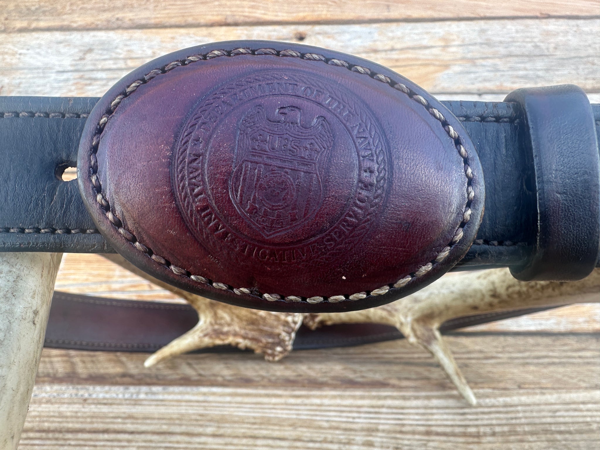 Vintage 1966 Strong Leather Co. cordovan brown leather gun belt. Belt was purchased from Strong Leather Company in 1966 by an Agent of the O.N.I. when their name was changed to N.I.S. Though holsters, cartridge carriers and cuff holders were provided by the government. This time this item was a private purchase item and not offered to the public. Oval leather buckle is stamped Department Of The Navy over  Naval Intelligence Service. Center of buckle has vintage United States (US) Naval Intelligence Special Agent badge. Belt is 1 3/8" wide and buckle can be removed. Belt measures 35 1/4" to smallest setting and 39 1/4" to largest setting. This is measuring from the buckles metal tine to the first and last settings with 3 others in-between. Very rare item you will not see again..