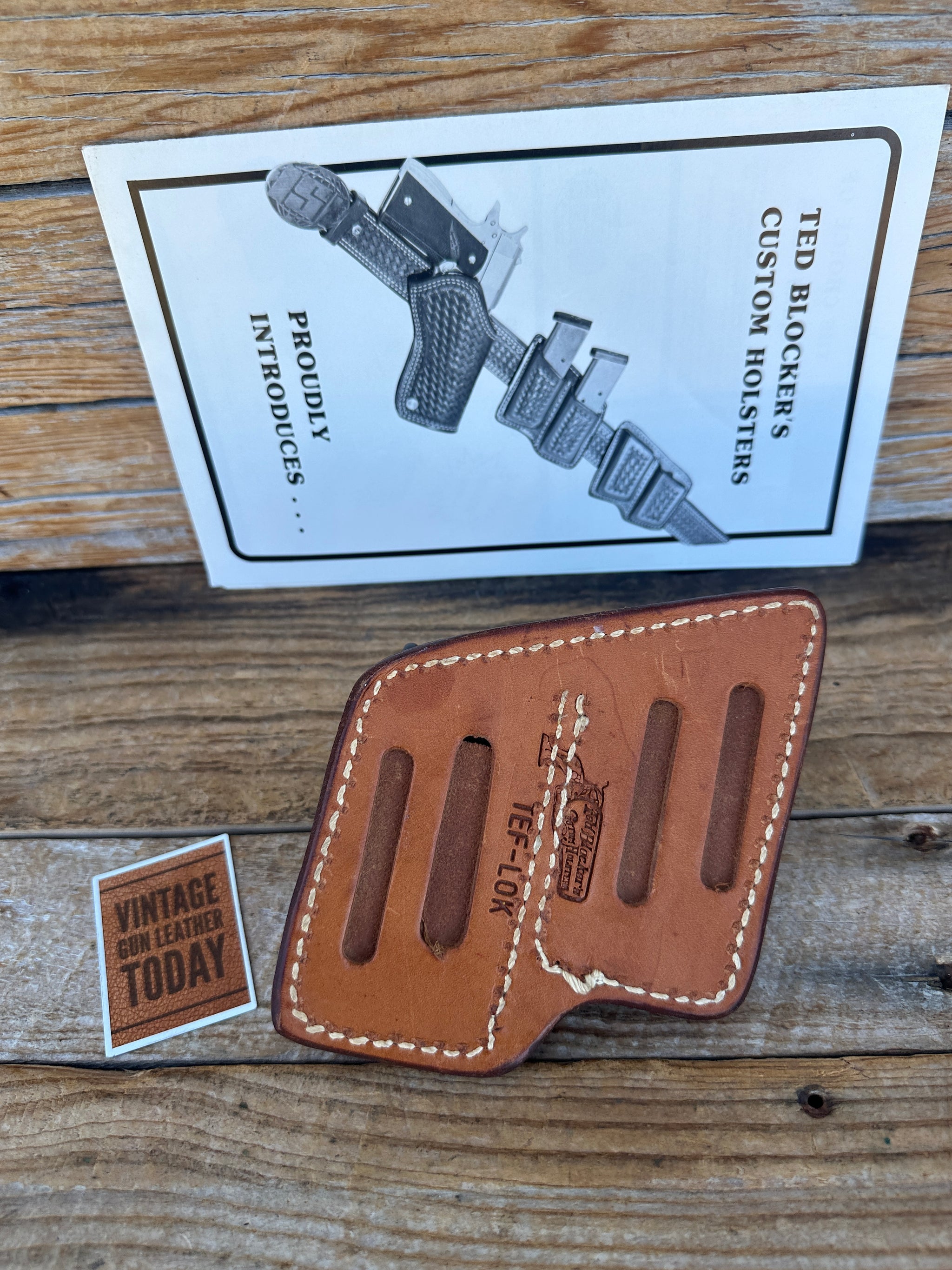Vintage, beautiful Ted Blocker brown leather stamped with early Blocker stamp, double magazine carrier. Magazine carrier will hold 2 Colt 45 1911 magazines. Carrier has 2 tension springs to retain magazines. Rear has a slot to fit a belt up to 2 1/2". Just a beautifully done set. Leather, stitching and hardware all in like NEW condition..