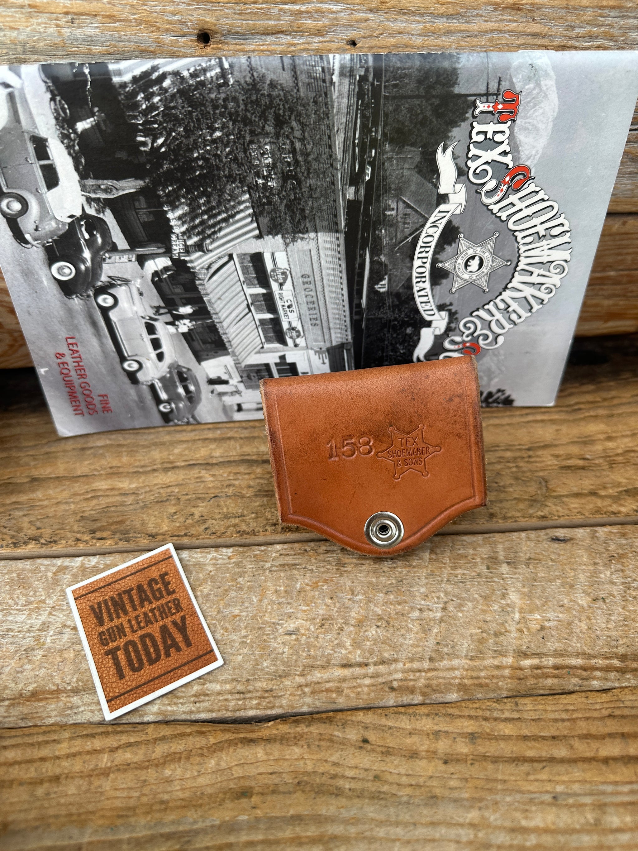 Vintage new old stock 1970's - 1980's Tex Shoemaker brown leather floral carved cartridge slide. Slide is #158 for 6 .38 / .357 cartridges. Slot will fit a belt up to 1 3/4". This is new old stock with some discoloration..