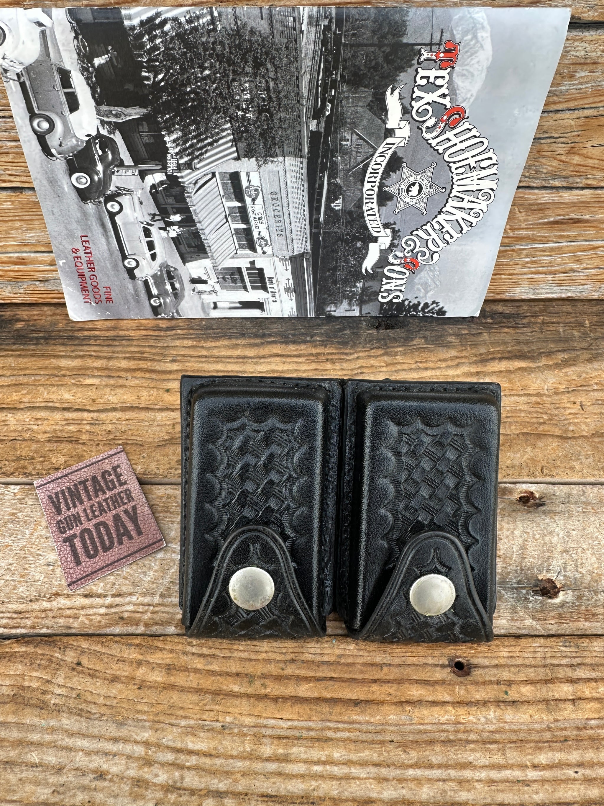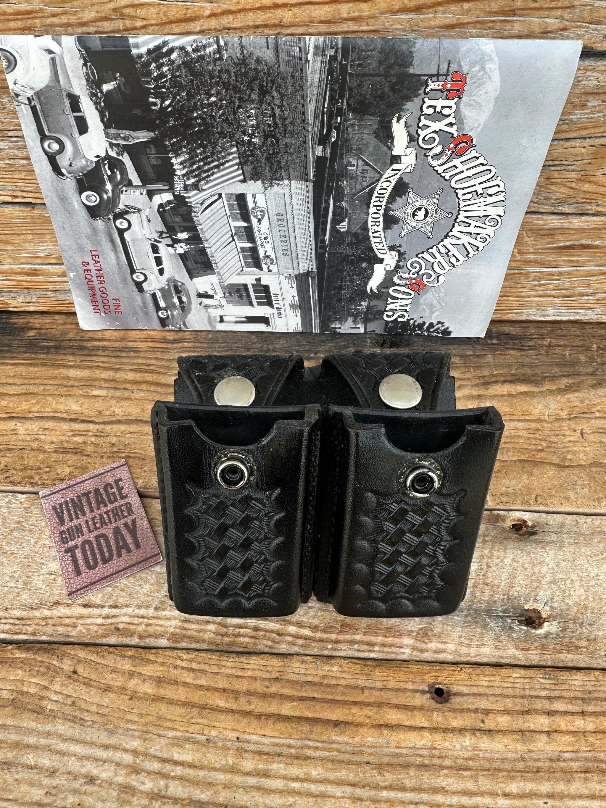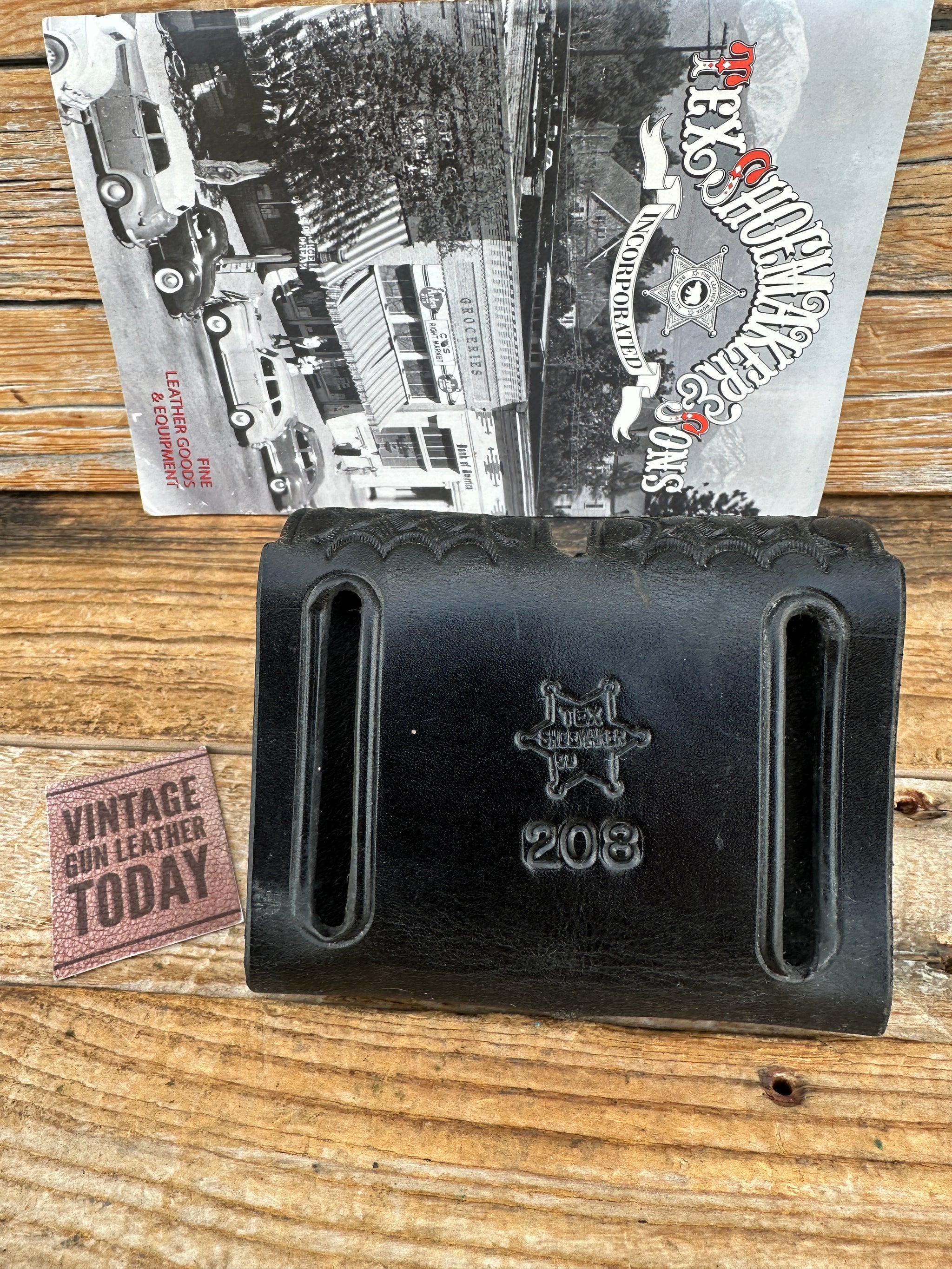 Vintage 1960's - 1970's production, Tex Shoemaker Model 208, black basket stamped leather double dump box. Box has nickel hardware and will fit a belt up to 2 1/2". This will hold 12 .38 or .357 cartridges. Each box dumps independent of the other. Leather, stitching and hardware all in very nice condition..
