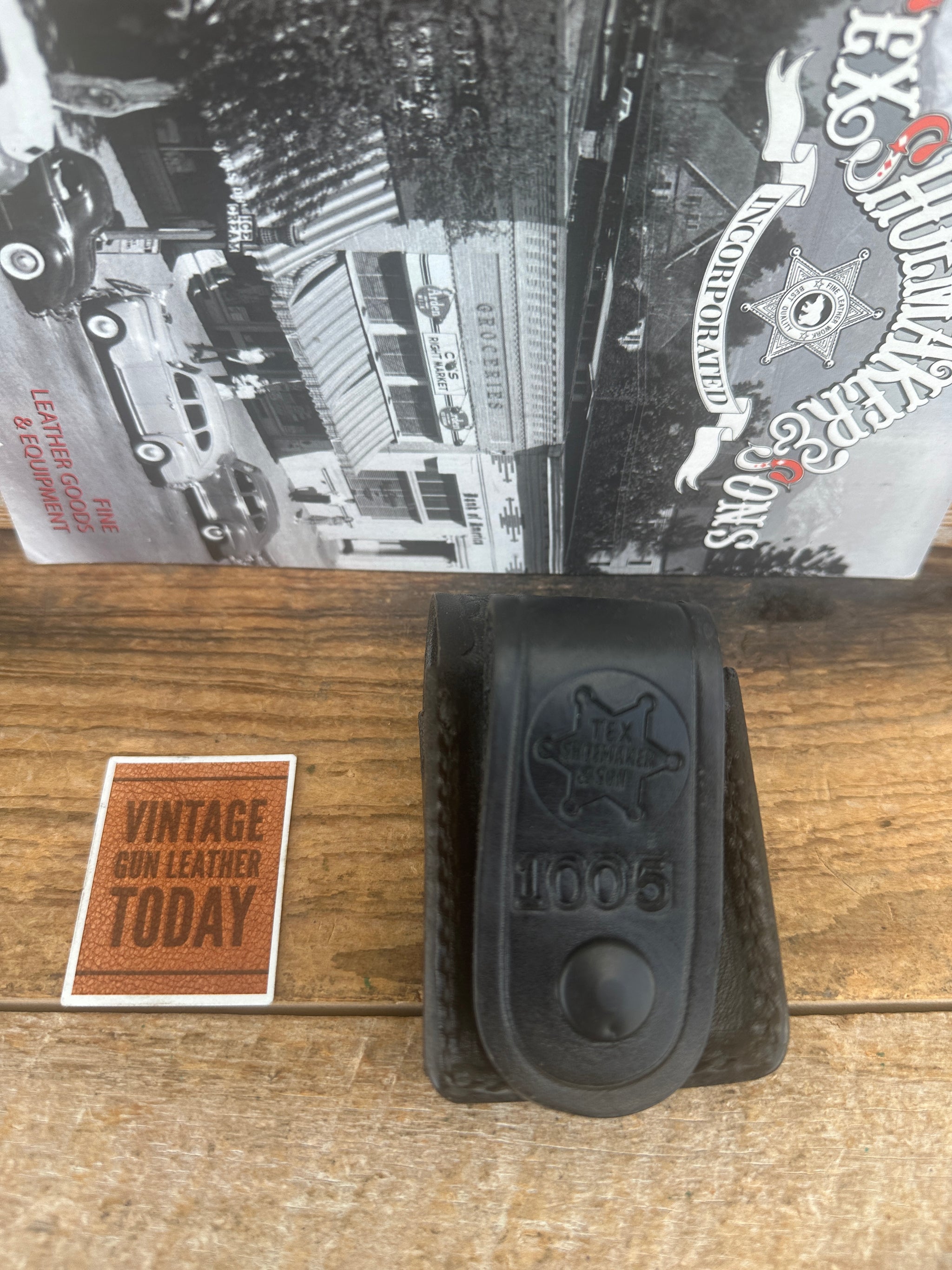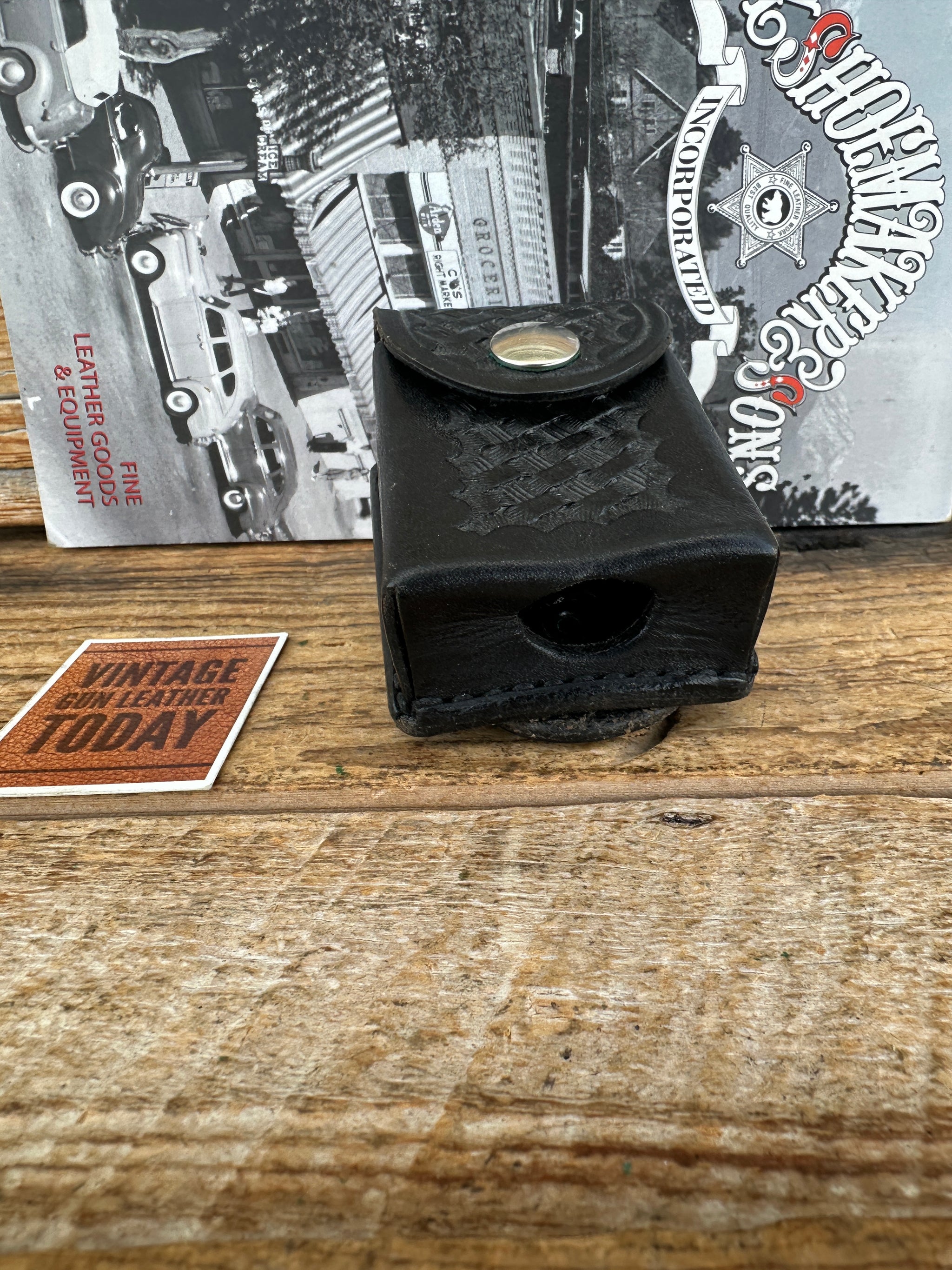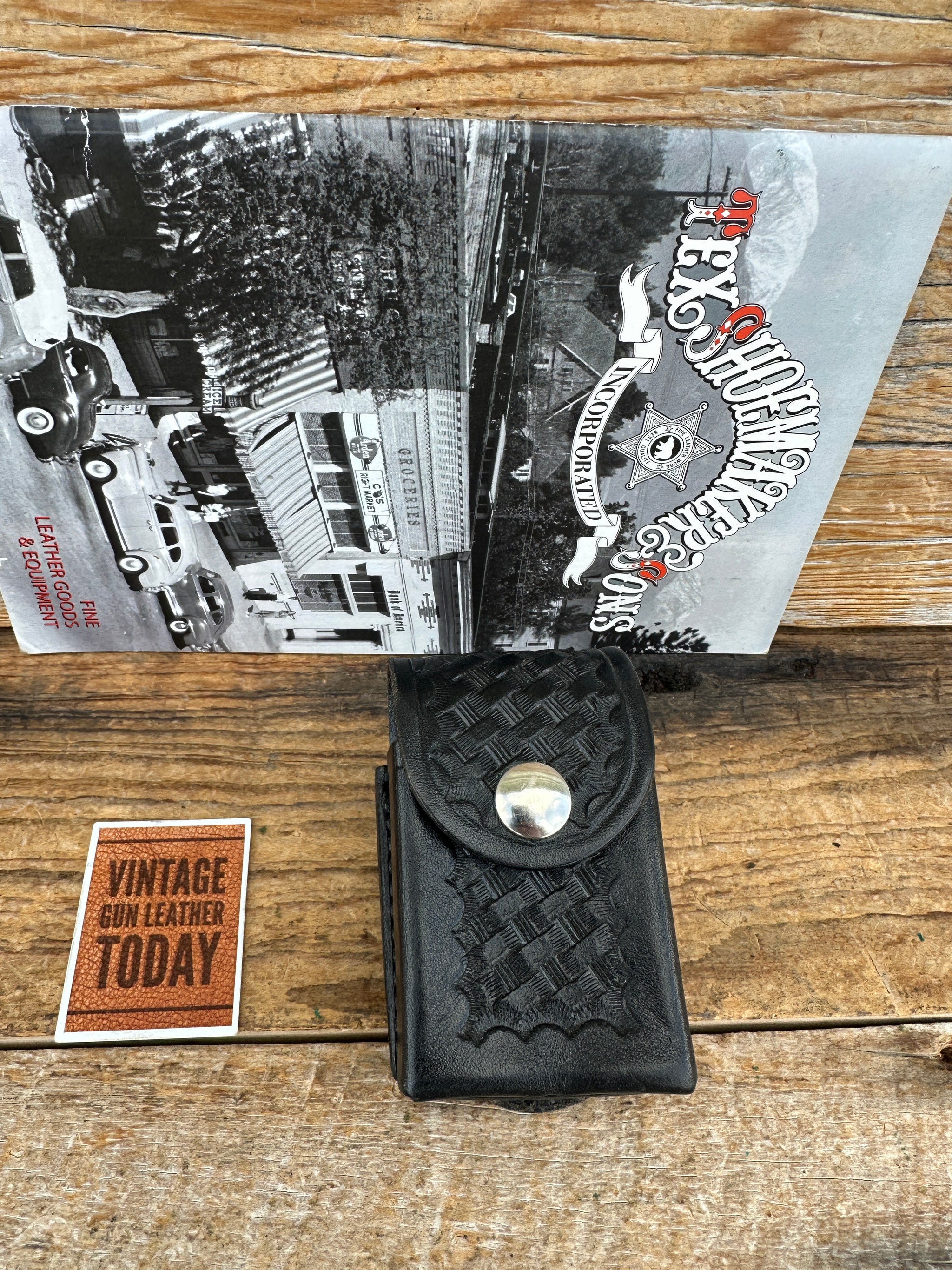 Vintage Tex Shoemaker black basket stamped leather 1005 case. Case interior measurements are 3 1/4" x 2" x 1". Flap Nickel hardware l. Bottom has a 3/4" cutout to push item up and out and side has a 1/2" cutout below flap. I believe this was for a panic button or K9 release. Rear has a loop with a directional snap for a belt up to 2 1/2". This is new old stock..
