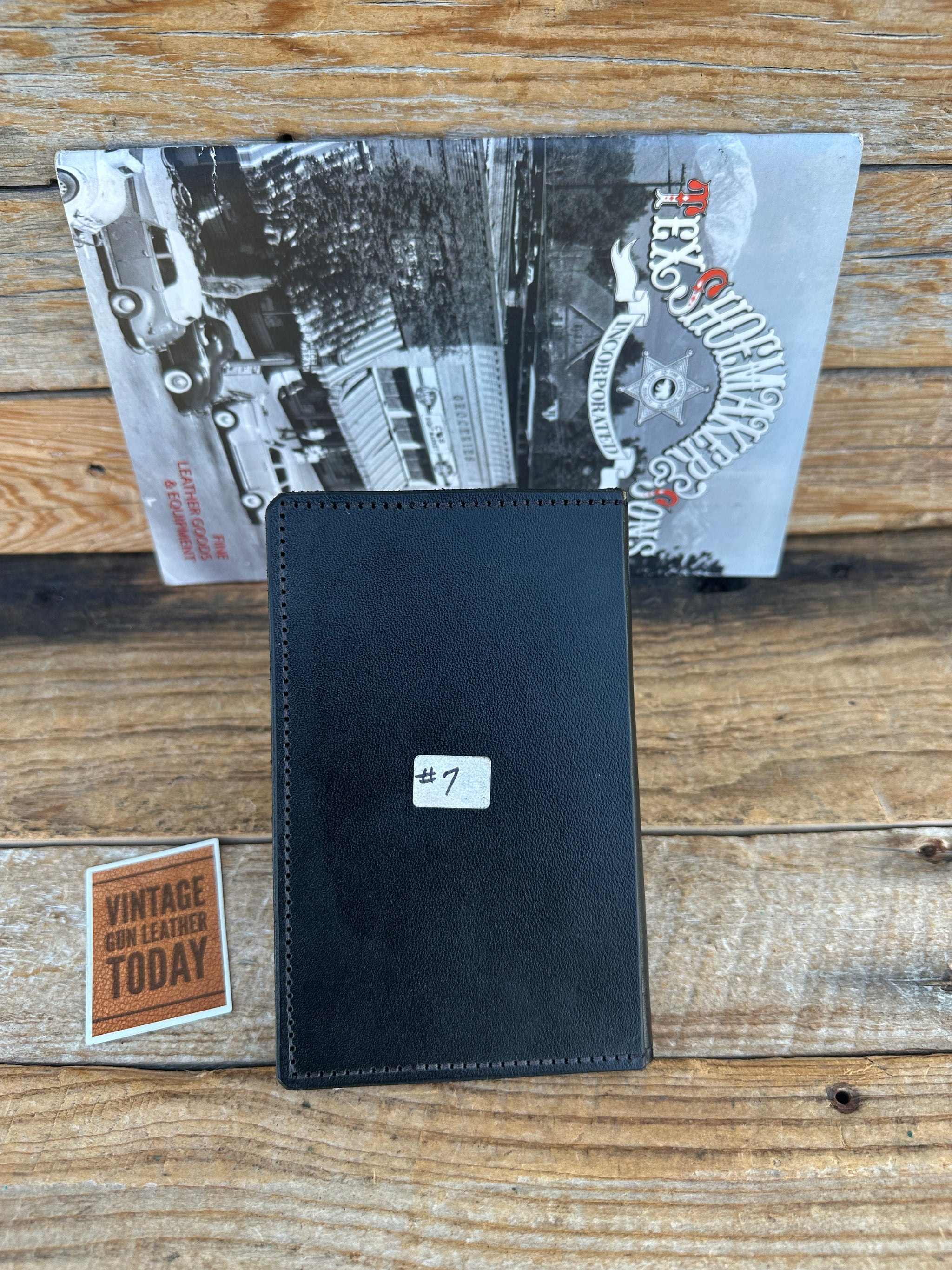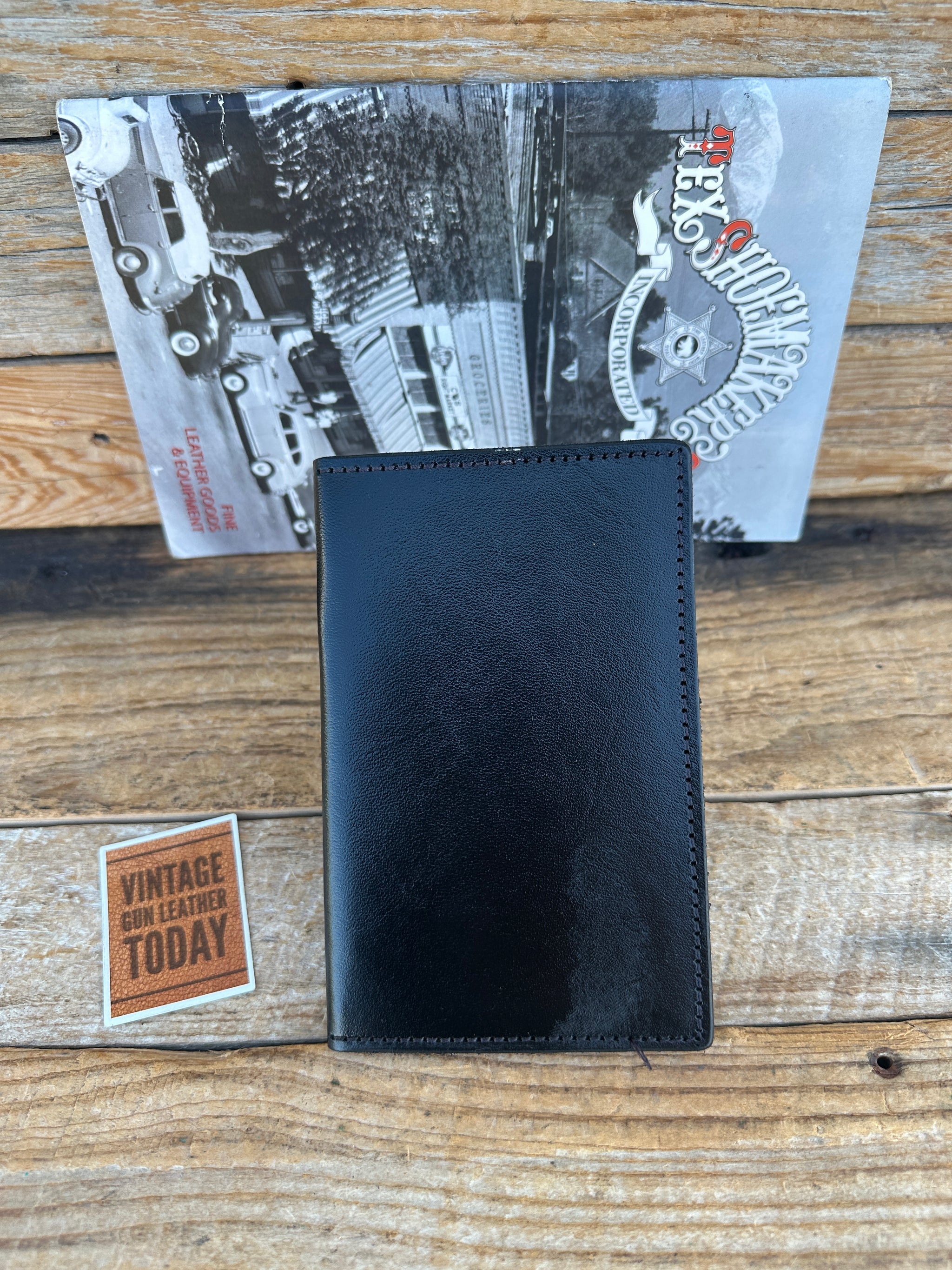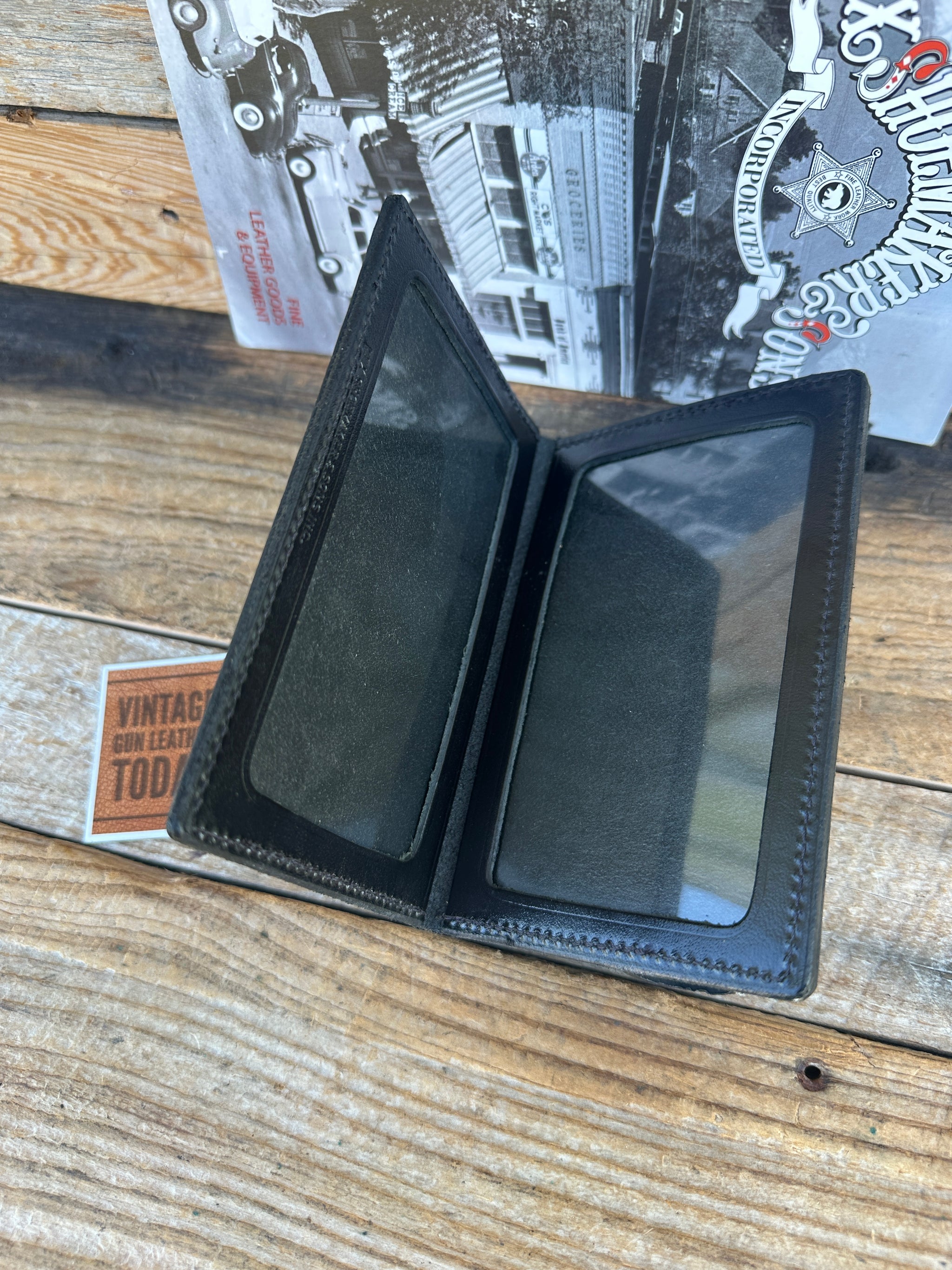Vintage new old stock Tex Shoemaker plain black double ID wallet. This will hold 2 ID cards up to 5" x 3". Rear has storage area for cards or folded cash. Very high quality..