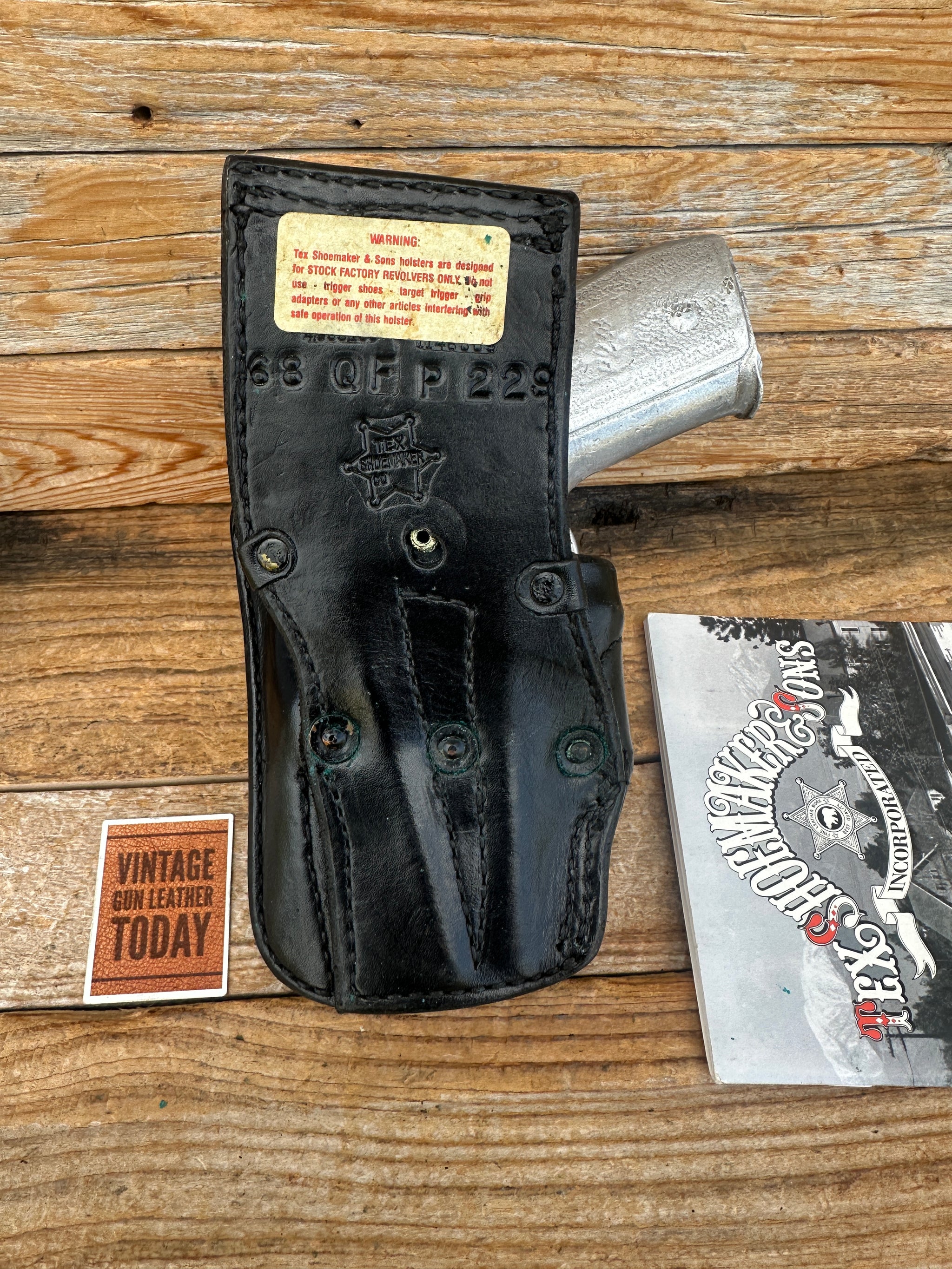 Vintage New Old Stock Tex Shoemaker Quick Front holster. Holster is black leather, smooth leather lined and hand floral carved. This is Right draw for a Sig Sauer P228 / P229 without rail. Just a beautifully made holster from a iconic company..