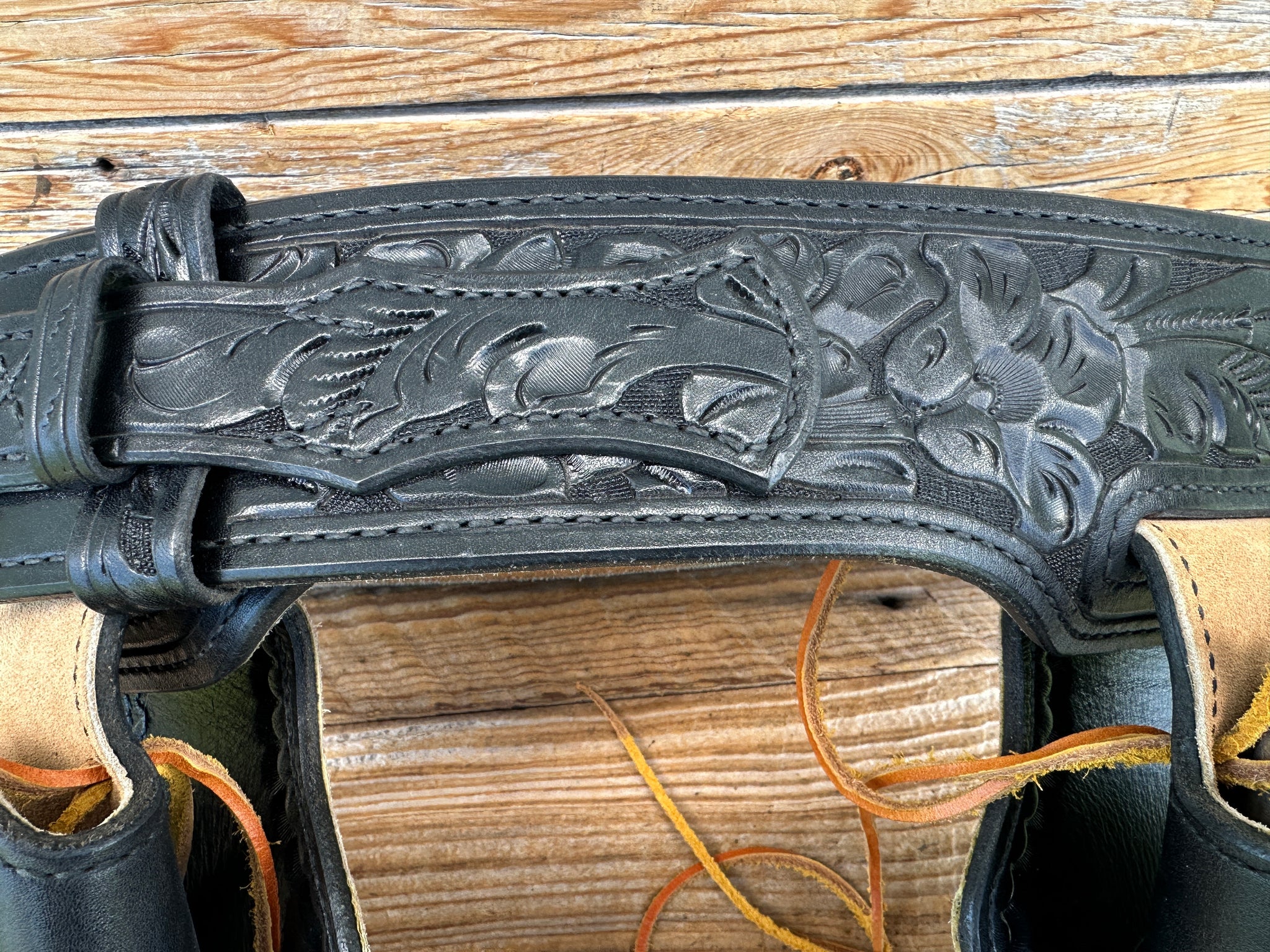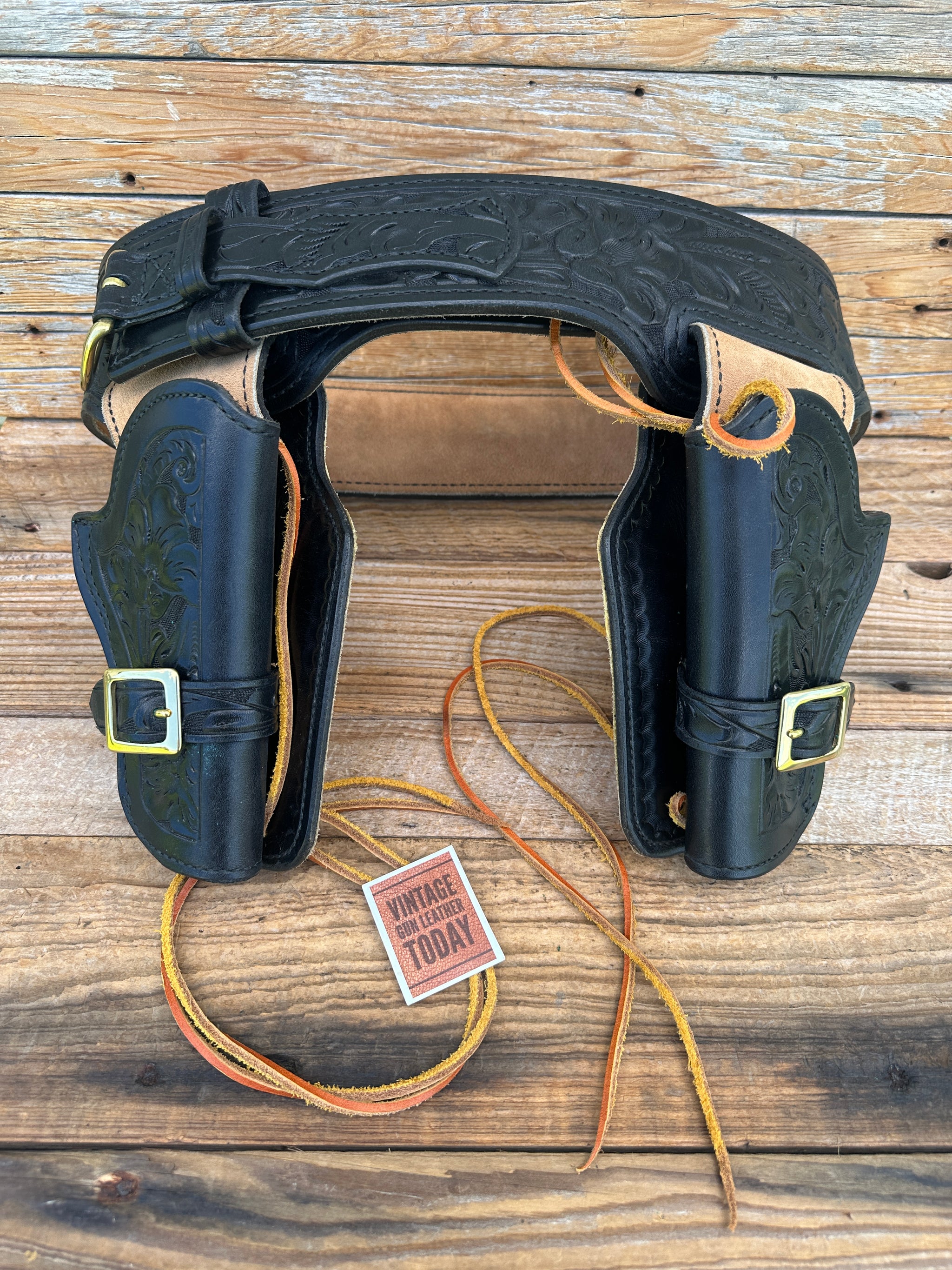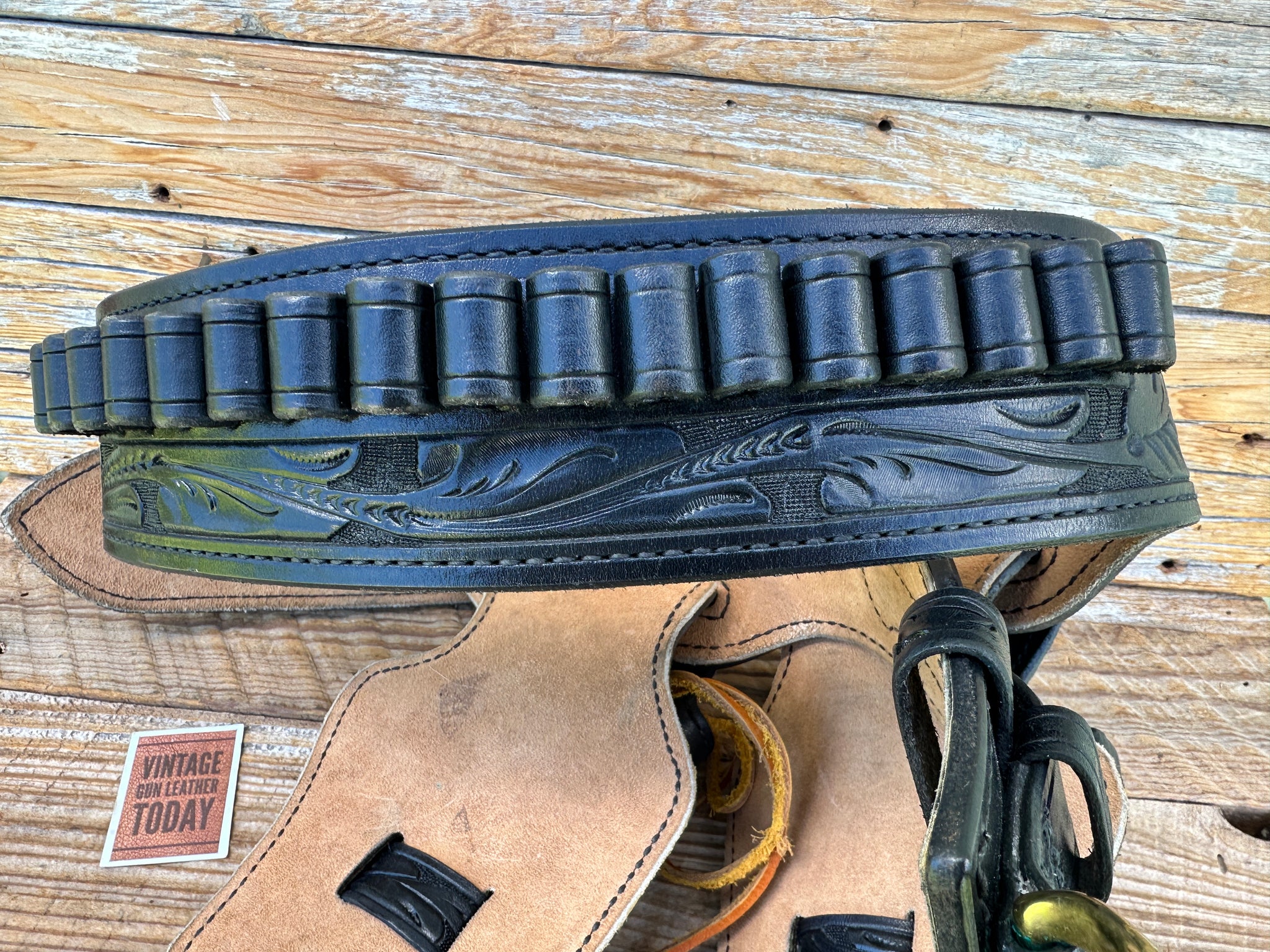 Vintage new old stock Tex Shoemaker black hand floral carved western gun belt. Measuring belt from leather end prior to buckle to smallest setting is 45 1/2" and 49 1/2" to largest setting. Belt is suede line with 24 .45 Long Colt cartridge loops, 2 3/4" wide with solid brass buckle. Holsters are both suede lined with solid brass buckles and rawhide hammer and leg thong. Holster is for a Ruger Vaquero Single Action 4 5/8""..